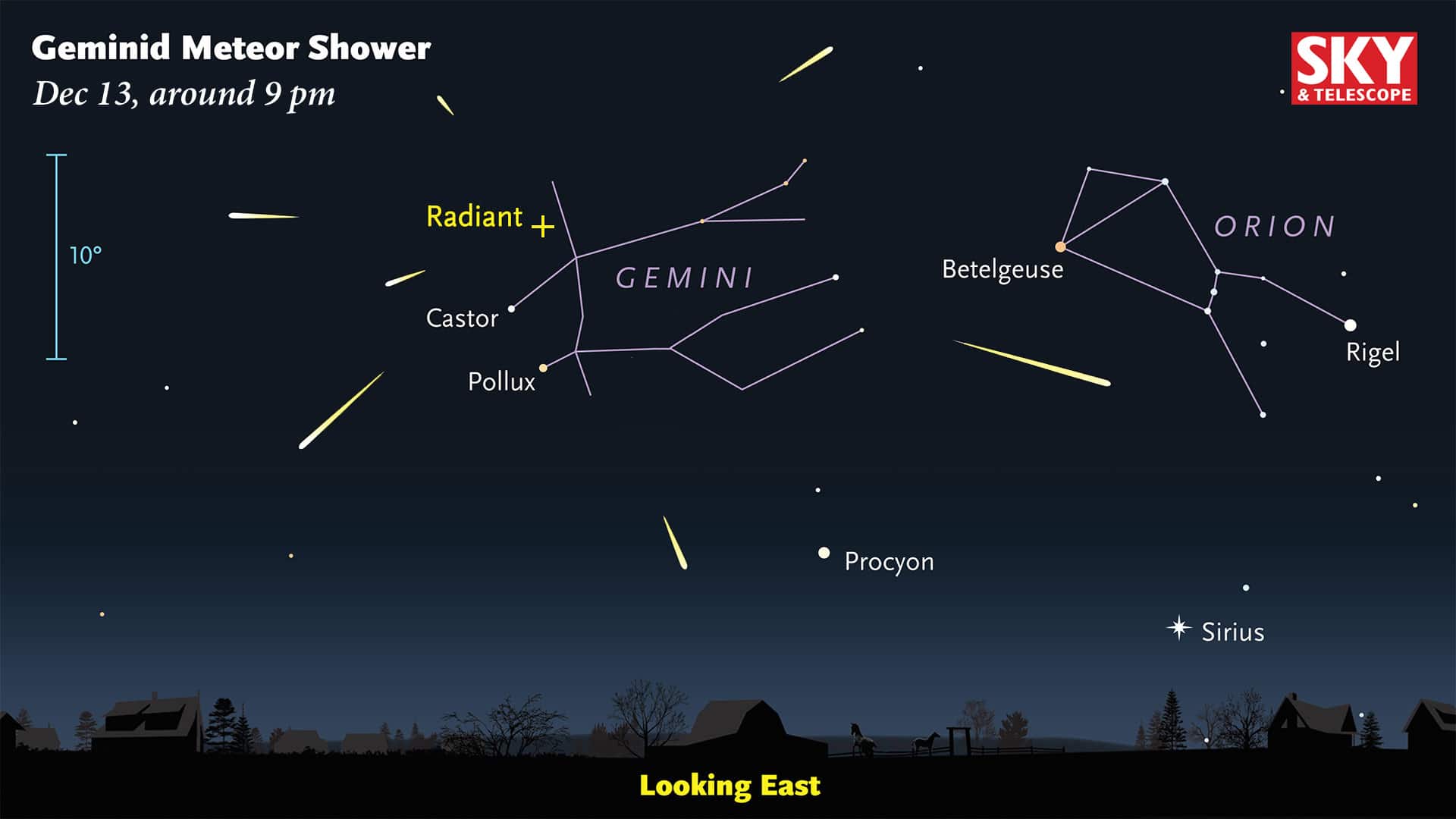 Geminid meteors can flash into view anywhere in the late-night sky. But if you follow their paths back far enough, they all appear to diverge from a point in the constellation Gemini. The meteors’ perspective point of origin is called the shower’s radiant. Don’t expect to see several meteors at once! This diagram is meant only to show their divergence from the radiant point. Image from skyandtelescope.