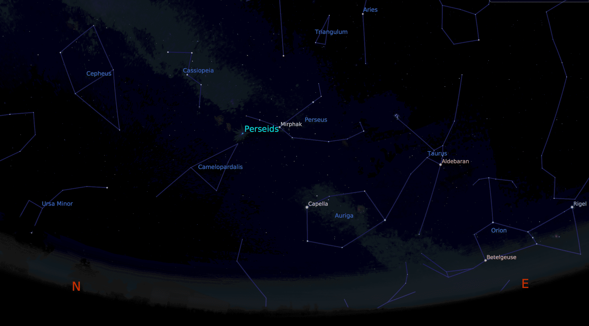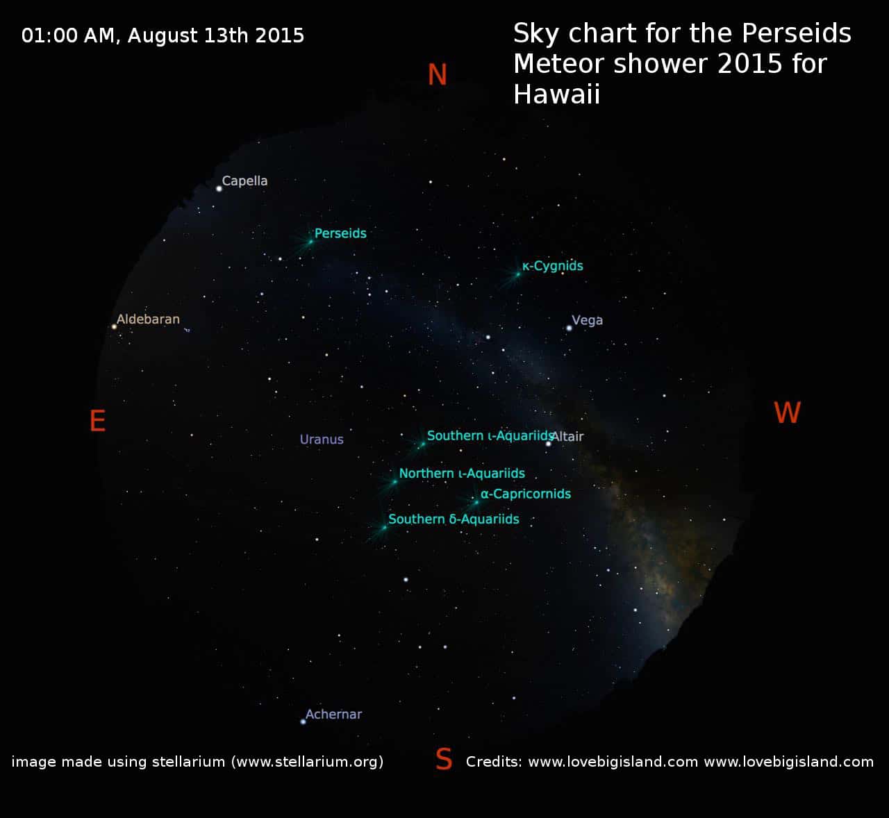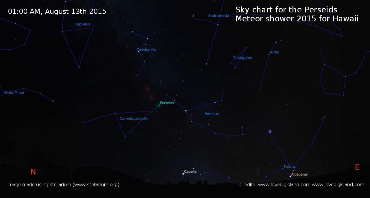 - Skymap for Hilo during the peak of the Perseids meteor shower, at 01:00 am on August 13th, 2015. The radiant of the meteor shower is marked ‘Perseids’.
