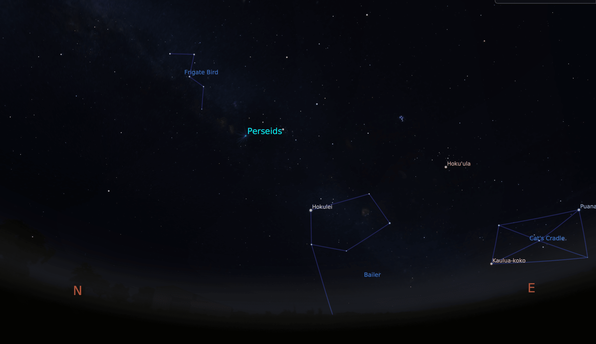 - Skymap for Hilo during the peak of the Perseids meteor shower, at 03:00 am on August 13th, 2015. The radiant of the meteor shower is marked ‘Perseids’. We also showthe location of several polynesian constellations.