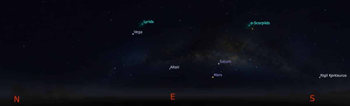 The best time to watch the Lyrids from Hawaii is April 22nd between 1 and 5 am. Skymap showing the Hilo nightsky at April 22nd 2018 made using the free planetarium software Stellarium