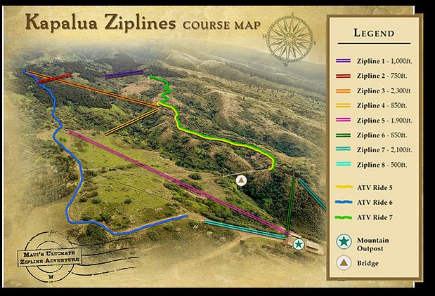 You can see all Kapalua ziplines in the map below. For the 4-line zipling tour (the one one this page) you will zip down ziplines #5, 6, 7, and 8. You will also ride an ATV up to the departure points for lines 5, 6, and 7.